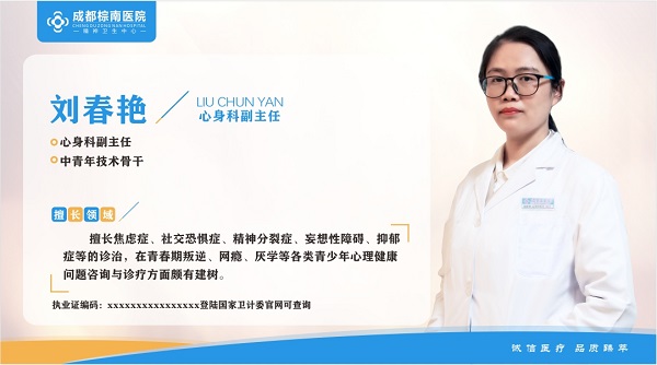 摘要刘春艳 医生简介 毕业于川北医学院,曾在南充市精神卫生中心工作。从事精神卫生临床诊疗工作近20年,理论知识扎实,临床经验丰富。擅长焦虑症、社交恐惧症、精神分裂症、妄想性
