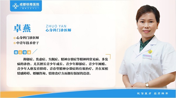 要卓燕 医生介绍 心身科门诊医师,中青年技术骨干,擅长抑郁症/焦虑症/失眠症精神分裂症等精神科常见病多发病的诊治.尤其擅长青少你成长,青少你抑郁症,青少你网瘾,青少你人格发育障碍